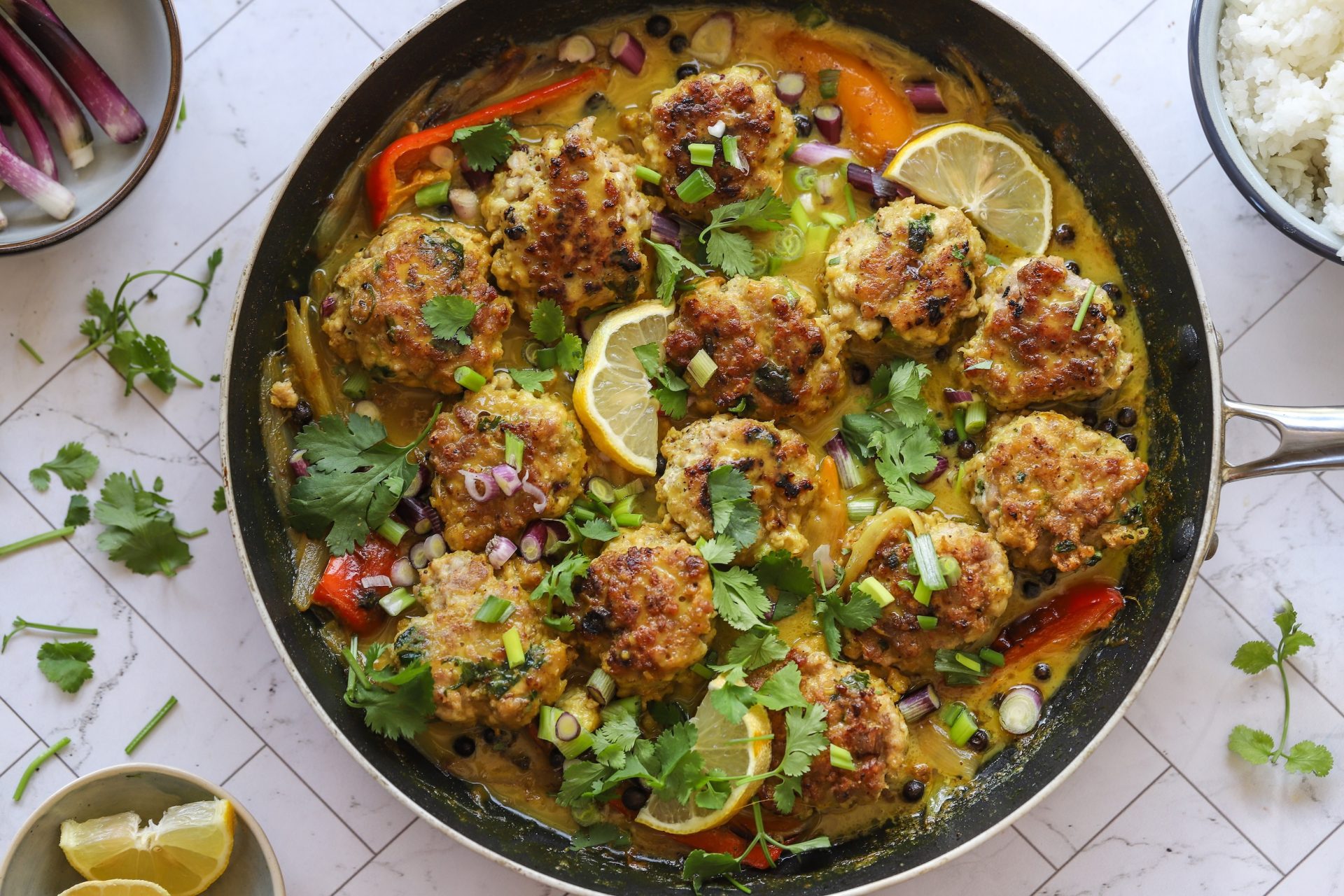 Serve: Spoon the meatballs and sauce over fluffy cooked rice and top generously with fresh coriander, sliced spring onions, and lemon or lime wedges on the side.