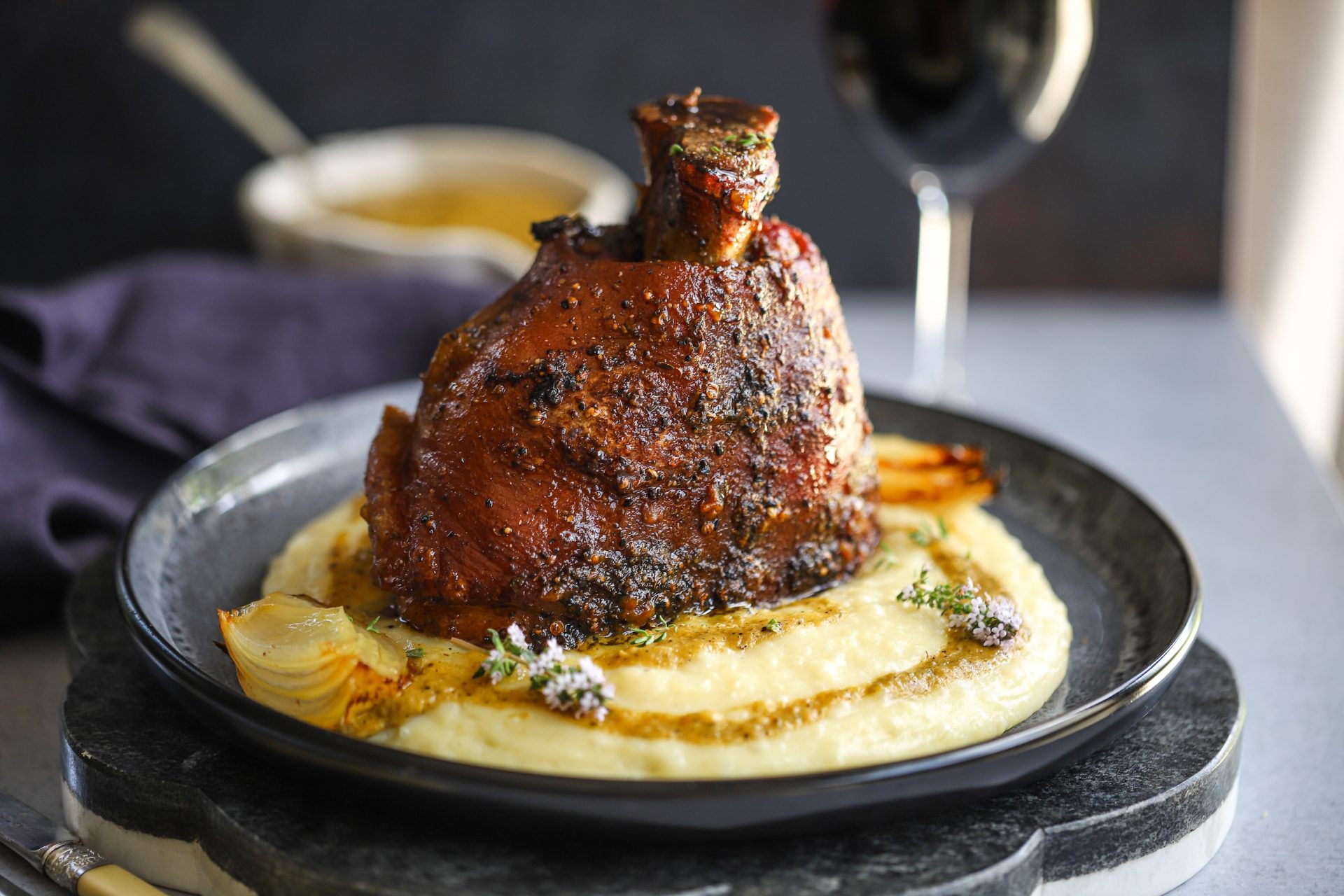 Slow-braised pork shank with creamy mash